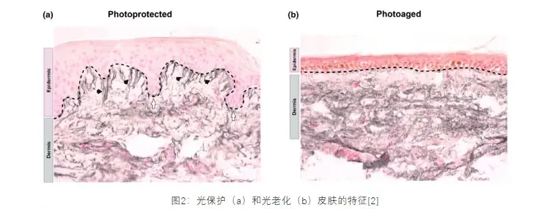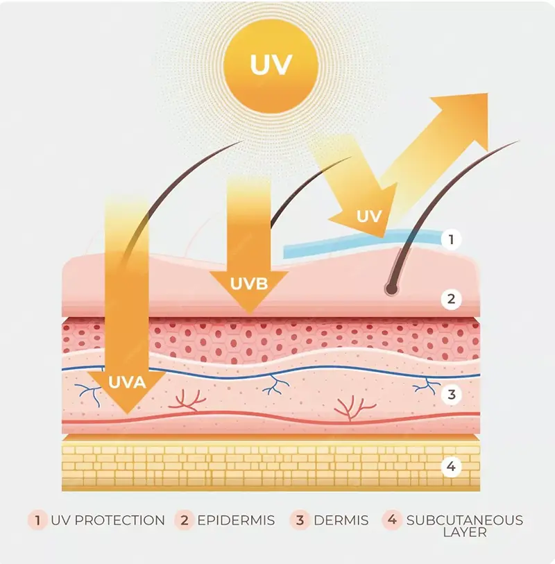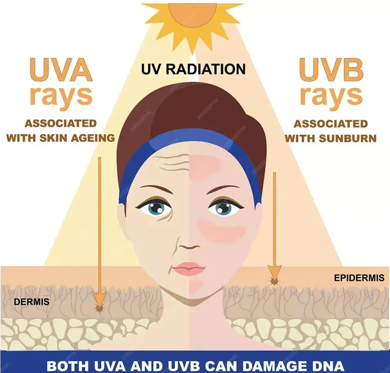 UVA மற்றும் UVB இரண்டும் தோல் சேதத்தை ஏற்படுத்தும், ஆனால் அவற்றின் ஊடுருவல் ஆழம் காரணமாக அவற்றின் விளைவுகள் வேறுபட்டவை. வெளிப்படையாக, பணக்கார UVA சருமத்தில் ஆழமாக ஊடுருவி, புகைப்படம் எடுப்பதுடன் நேரடியாக தொடர்புடையது, ஏனெனில் அவை ROS ஐ உருவாக்கி கொலாஜன் மற்றும் எலாஸ்டினை சிதைக்கும், இது சுருக்கங்கள், தோல் நெகிழ்ச்சி இழப்பு மற்றும் முன்கூட்டிய வயதான அறிகுறிகளுக்கு வழிவகுக்கும். இதற்கு நேர்மாறாக, UVB முக்கியமாக மேல்தோலை பாதிக்கிறது, சூரிய எரித்மா (சூரிய எரித்மா) மற்றும் மெலனின் உற்பத்தியை குறுகிய காலத்தில் ஏற்படுத்துகிறது, அதே நேரத்தில் நீண்ட கால வெளிப்பாடு ஹைபர்கெராடோசிஸுக்கு வழிவகுக்கும் மற்றும் தோல் வீரியம் மிக்க கட்டிகளின் அபாயத்தை கணிசமாக அதிகரிக்கும்.