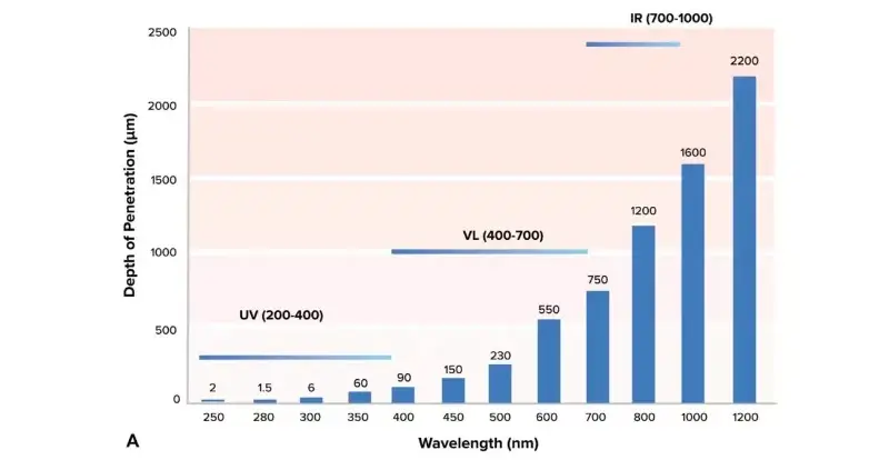 மேலே உள்ள படத்தில் காட்டப்பட்டுள்ளபடி, புலப்படும் ஒளி தோலில் பெரும் தாக்கத்தை ஏற்படுத்துகிறது, ஏனெனில் இந்த இசைக்குழு தோலில் ஆழமான ஊடுருவல் ஆழத்தைக் கொண்டுள்ளது. சிவப்பு ஒளியானது மேல்தோல் மற்றும் சருமத்தில் ஊடுருவி, கொழுப்பு அடுக்கை அடையும், இது அலைநீளம் மற்றும் ஊடுருவல் ஆழம் மற்றும் அலைநீளம் மற்றும் ஆற்றலுக்கு இடையிலான தலைகீழ் உறவைக் குறிக்கிறது, அதே நேரத்தில் நீல ஒளி சிவப்பு ஒளியை விட அதிக ஆற்றலையும் குறைந்த ஊடுருவல் ஆழத்தையும் கொண்டுள்ளது.